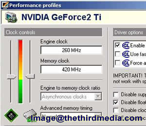 七、超频测试 最后要测试的自然是这款产品的超频能力了,经过笔者反复测试,这款产品在能够稳定工作的频率最后被定格在了260MHz/420MHz(参考下图)上面。由于显存的问题,它和丽台、耕昇显卡的超频能力都有一定差距。